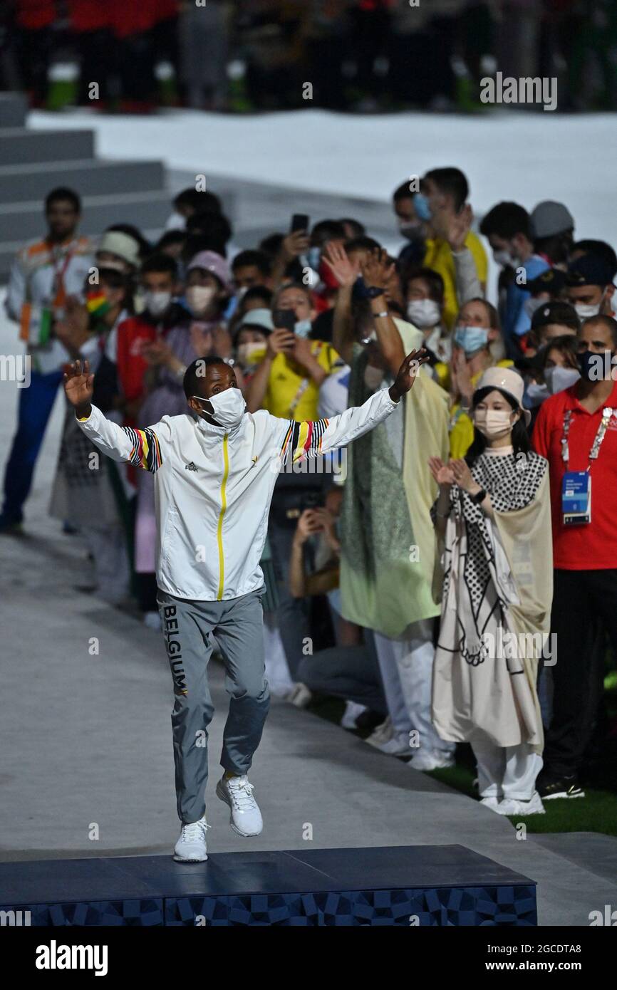 Der Belgier Bashir Abdi Feiert Seine Bronzemedaille Wahrend Der Medaillenzeremonie Fur Den Manner Marathon Wahrend Der Abschlusszeremonie Der Olympischen Spiele Von Tokio 2020 Stockfotografie Alamy